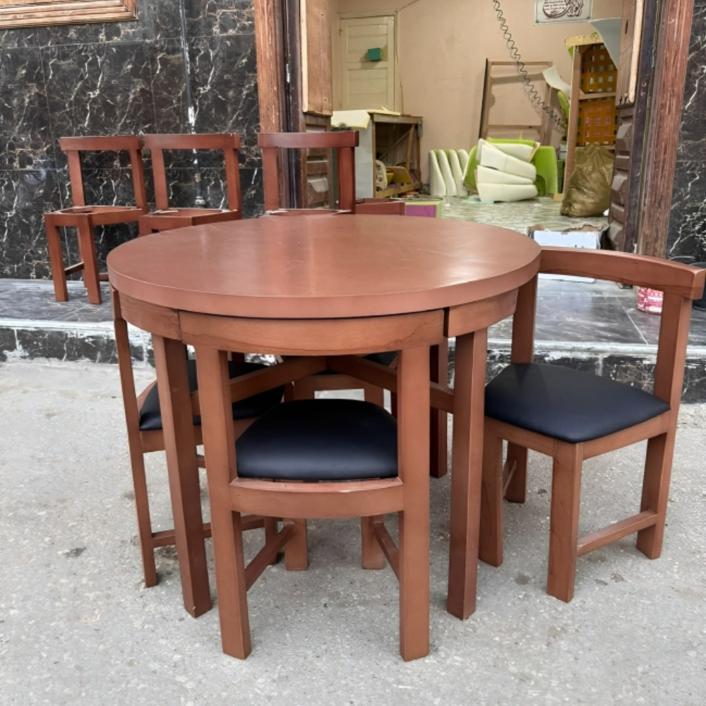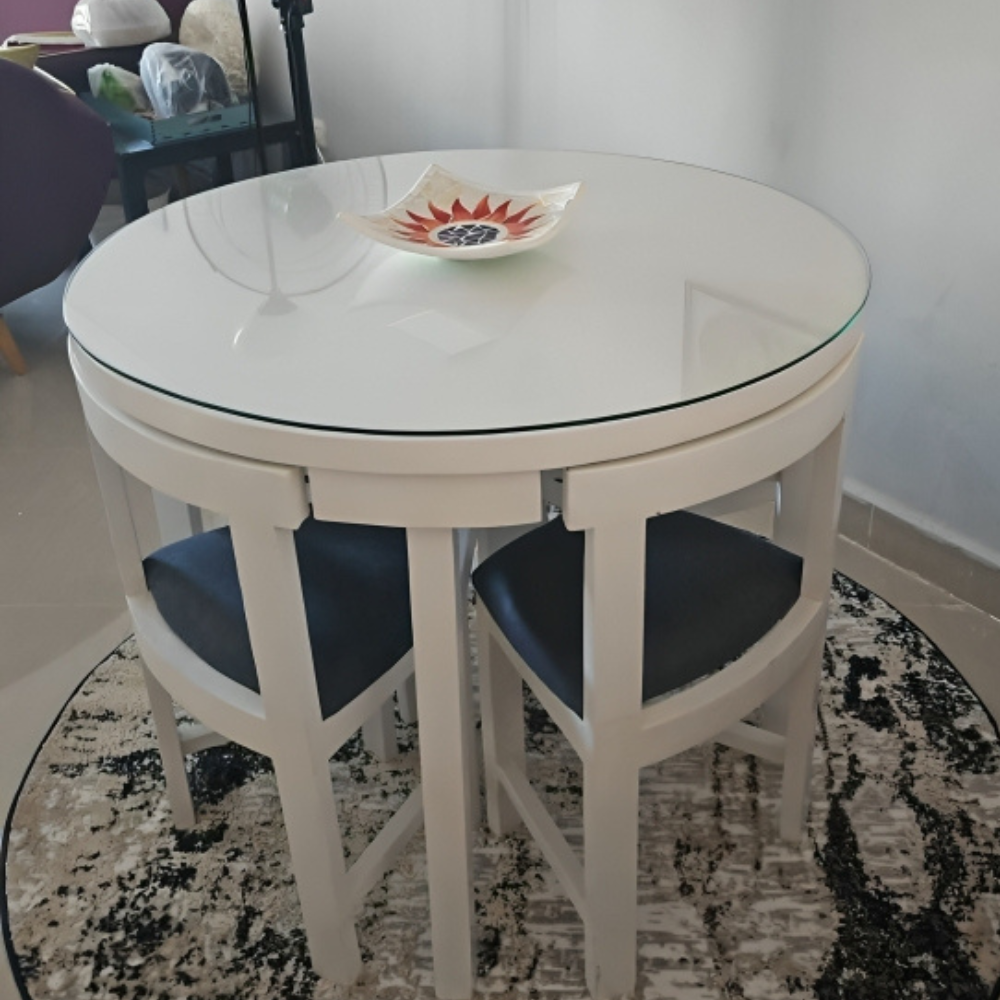 - تصميم “متداخل” يوفر لك المساحة: الابتكار الحقيقي يكمن في الكراسي الأربعة التي تنزلق بسلاسة تحت الترابيزة لتصبح قطعة واحدة مدمجة. هذا التصميم يمنحك اتساعاً بصرياً وحرية حركة في غرفتك، دون التضحية بعدد المقاعد.
